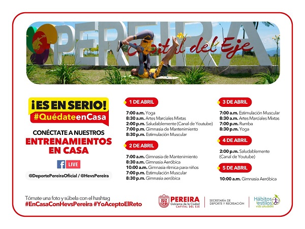 Disfrute de nuevas sesiones de actividad física con los entrenamientos en casa de la Secretaría de DeporteJuan Carlos Sanchezabril 1, 2020La Secretaría de Deporte y Recreación de Pereira continúa llevando actividad física a ... Leer más