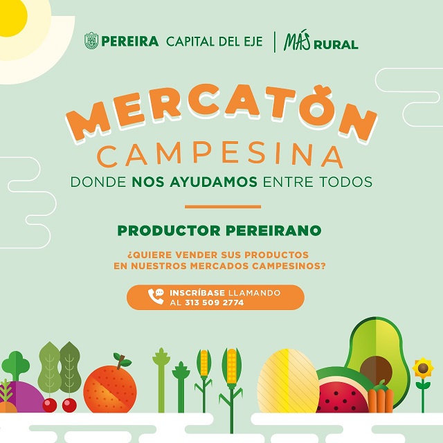 El Gobierno de la Ciudad a través de la Secretaría de Desarrollo Rural y Gestión Ambiental dio apertura a las inscripciones para la Mercatón Campesina, un espacio donde los productores rurales podrán vender sus productos a precios justos y sin intermediarios. Sandra Granada, secretaria de Desarrollo Rural y Gestión Ambiental, invitó a todos los productores rurales para que se inscriban y participen de estos mercados que se realizarán en varios sectores de la ciudad cumpliendo con todas las medidas de bioseguridad. “Queremos que todos nuestros productores del campo aprovechen esta oportunidad y participen de la Mercatón Campesina, un espacio para llevar los alimentos que producimos del campo, a la mesa de todos los pereiranos”, expresó la funcionaria. Los interesados en participar de la Mercatón Campesina se deben inscribir en la línea habilitada por la Secretaría de Desarrollo Rural y Gestión Ambiental, 3135092774. EL PROCESO Una vez el productor realice el proceso de inscripción recibirá una visita de los profesionales de la Secretaría de Desarrollo Rural quienes verificarán la calidad de los productos para garantizar que los pereiranos tengan en sus mesas las mejores cosechas. Es importante recordar que: La inscripción está abierta para productores de Pereira. Los productos deben cumplir con todos los parámetros de calidad para su consumo. Todos los procesos de participación en la Mercatón Campesina son gratis para los productores Por último, la Secretaría de Desarrollo Rural invitó a todos los pereiranos a comprar en la Mercatón Campesina y apoyar la economía de los productores rurales. DATO DE INTERÉS Con la Mercatón Campesina se espera beneficiar a más de 400 productores rurales en la vigencia 2020.