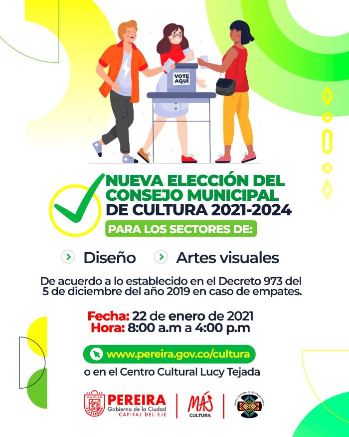 Los artistas y gestores culturales interesados en participar de esta nueva jornada electoral por desempate lo podrán hacer el viernes 22 de enero de 8:00 a. m. a 4:00 p. m. vía virtual en www.pereira.gov.co/cultura o presencial en el Centro Cultural Lucy Tejada (piso 1). Para que el voto sea válido es importante que los votantes pertenezcan a los sectores de artes visuales o diseño, y estén registrados en la base de datos de la Secretaría de Cultura que se encuentra publicada en http://www.pereira.gov.co/Cultura/Paginas/Consejo-de-cultura.aspx