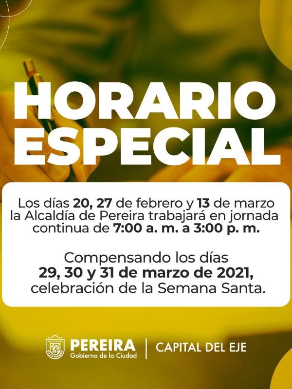 Alcaldía de Pereira laborará los sábados 20 , 27 de febrero y el 13 de marzo por celebración de Semana SantaJuan Carlos Sanchezfebrero 19, 2021Por motivos de la celebración de la semana mayor, durante los días 20 ... Leer más
