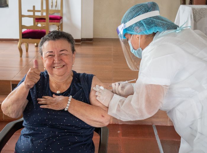 Las vacunas se han convertido para mucho de los abuelos en un motivo de alegría, como lo manifiesta Olga Mejía Restrepo, quien a sus 70 años de vida recibió la primera dosis de Coronavac. «Me acaban de colocar la vacuna y me siento feliz, para mí es como recibir un poquito de agua en el desierto… muy agradecidos con todos los de salud e invito a las personas que se vacunen, porque entre más vacunados hay menos contagio».