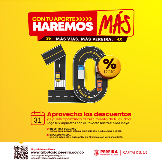 Hasta el 31 de mayo plazo para pago de impuestos con descuentosJuan Carlos Sanchezmarzo 16, 2021Con el objetivo de tener la Pereira que todos sueñan con más educación, ... Leer más