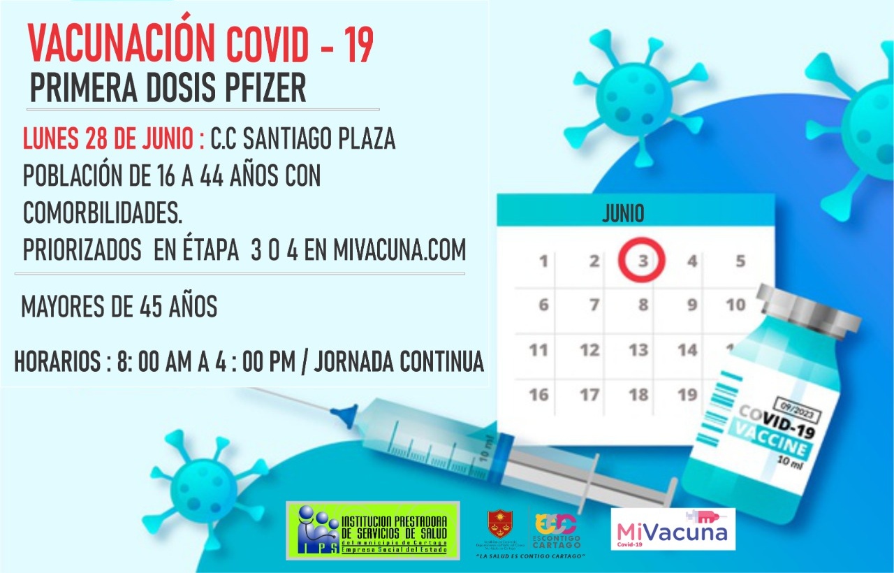 La IPS del municipio de Cartago informó que este lunes 28 de junio en el Centro Comercial Santiago Plaza inicia la vacunación etapa 4 Covid 19 que comprende la primera dosis de Pfizer para personas entre los 45 y 49 años. El horario será de 8am a 4pm en jornada continua. de Igual manera se aplicará la primera dosis para las edades entre 16 y 44 años en personas con comorbilidades.
