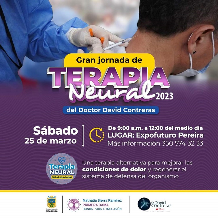 A partir de las 9:00 a.m. y hasta las 12:00 del mediodía de este sábado 25 de marzo en Expofuturo, se realizará la primera gran jornada de Terapia Neural de este año liderada por el Despacho de la Primera Dama de Risaralda y la Secretaría de Salud en el marco del programa “Risaralda sin dolor”.
