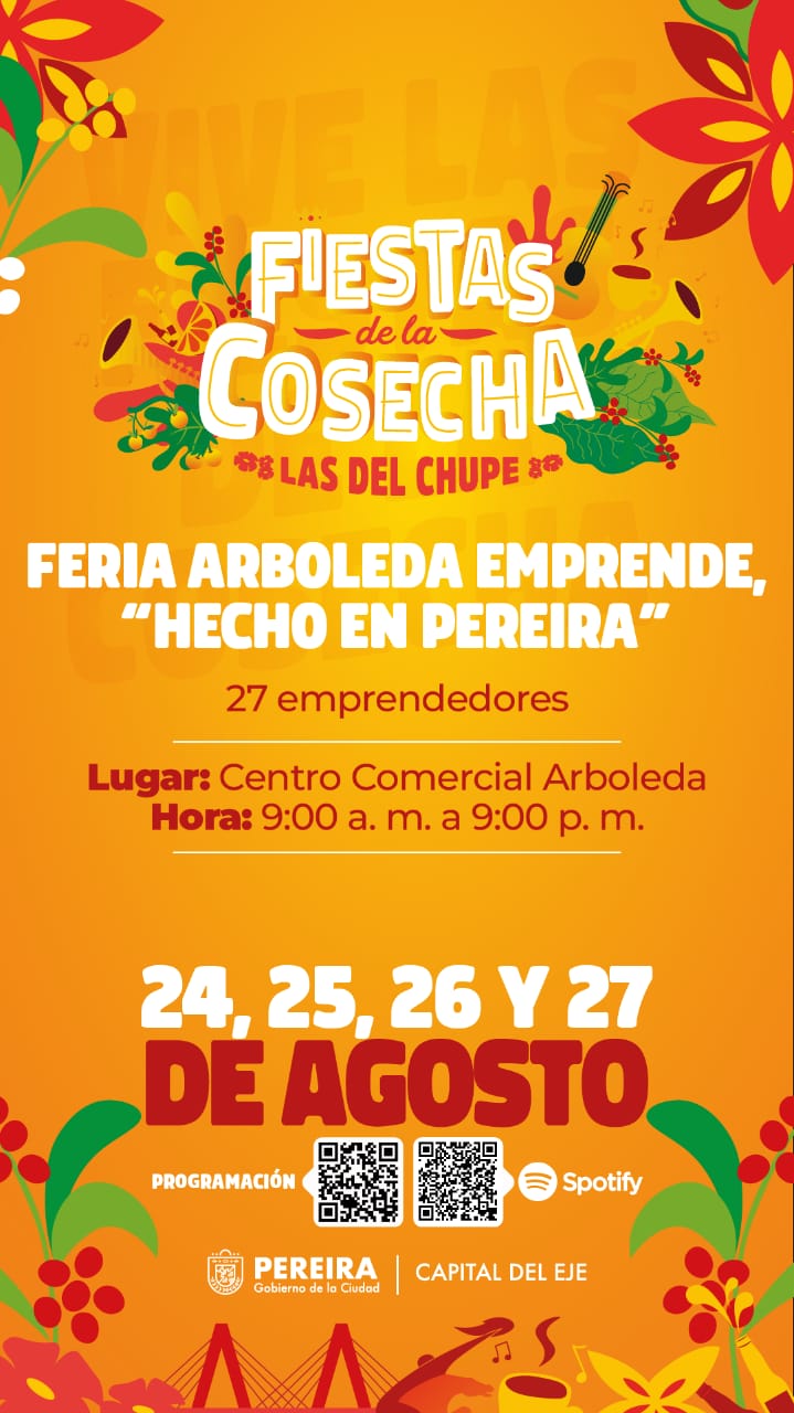 ● La feria “Emprende Arboleda” recibe 27 empresarios del programa “Hecho en Pereira ¡lo compro!”, quienes estarán desde el jueves 24 hasta el domingo 27 de agosto, entre las 10:00 a. m. y 8:00 p. m.