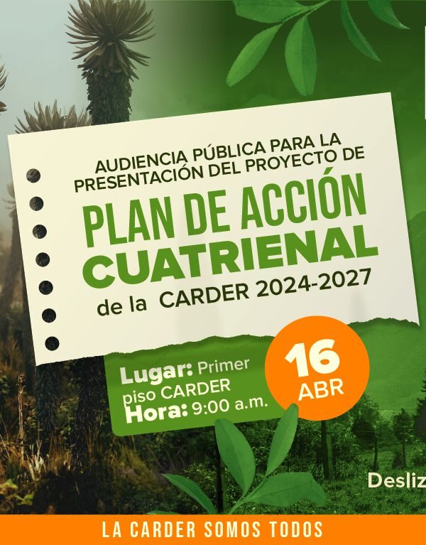 Este martes 16 de abril se realiza la Audiencia Pública para la presentación del Plan de Acción Cuatrienal 2024-2027 de la CARDERJuan Carlos Sanchezabril 16, 2024El Director General de la Corporación Autónoma Regional de Risaralda – CARDER, convoca: ... Leer más