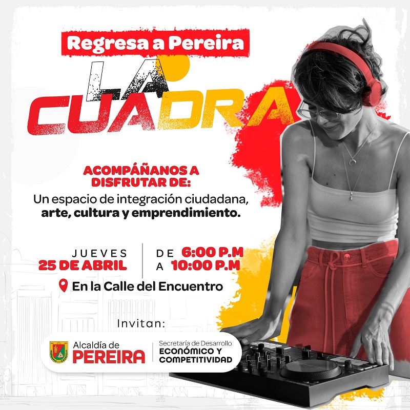 La Alcaldía de Pereira, a través de la Secretaría de Desarrollo Económico y Competitividad, se encuentra liderando el proceso de recuperación de los espacios que permiten el disfrute y la integración para propios y visitantes, es por eso que, por directriz del alcalde Mauricio Salazar Peláez, este jueves 25 de abril, entre las 6:00 p.m. y las 10:00 p.m. se llevará a cabo la gran Feria Artesanal, Cultural y de Emprendimiento “La Cuadra”, que busca revivir este espacio de apropiación ciudadana de gran recordación para todos los pereiranos.