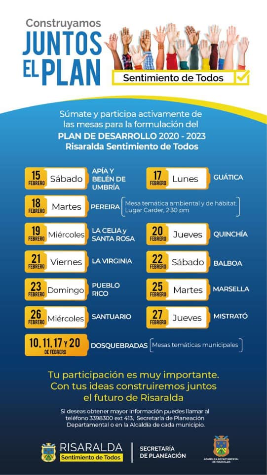 Gobernación de Risaralda inició construcción del Plan de Desarrollo con la participación de todos los municipiosJuan Carlos Sanchezfebrero 18, 2020Desde el sábado 15 de febrero y hasta el 27 del presente mes ... Leer más